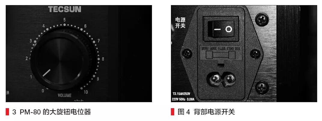 3个输入通道的指示灯颜色是分别为红、绿、蓝三色。正面右边的大旋钮为电位器(见图3)。虽然机器的功率不大,但是PM-80的两侧全部覆盖了散热片,看起来很有专业器材的味道。
