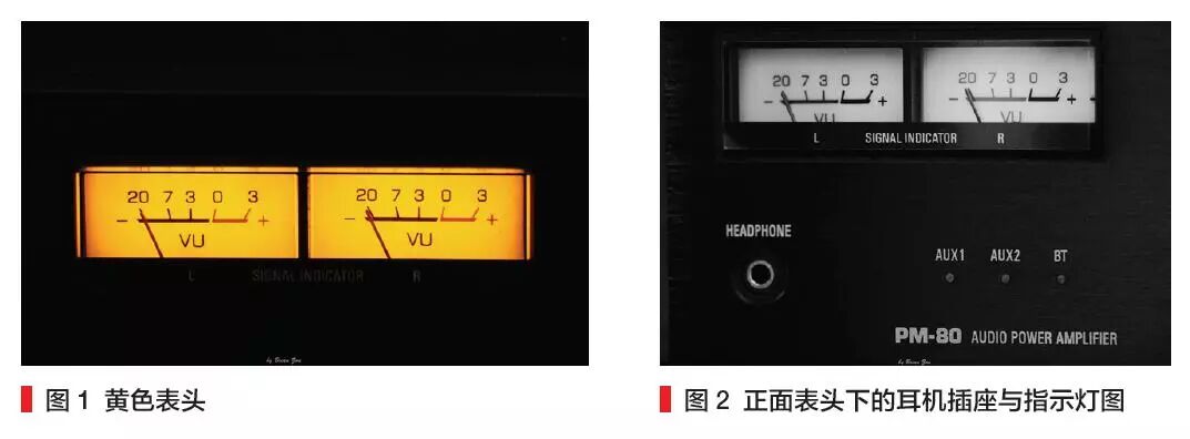 整机通体黑色,造型复古。正面最显眼的就是左上方的输入电平表,黄色的表头与黑色的外壳形成了巨大的反差,显得特别亮眼(见图1)。表头下方有一个3.5mm的耳机插座,边上是3个输入通道指示灯,分别对应AUX1、AUX2、蓝牙输入(见图2)。需要说明的是,这台功放的两个AUX输入端是不同的:AUX1的不失真电平是2~3V,为普通信号输入端,可接驳常规音源;而AUX2的不失真输入电平为0.6~1.5V,为低电平信号输入端,可接驳随身播放器的线路输出。