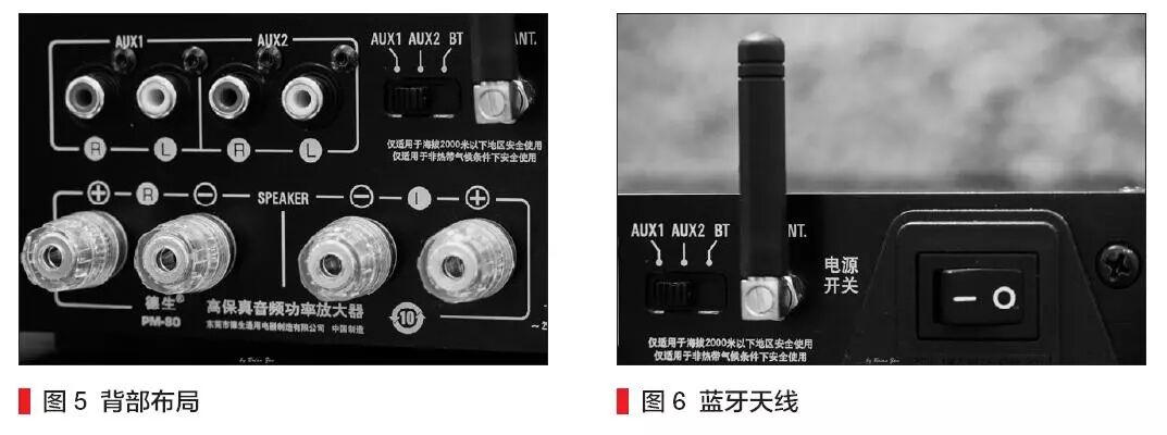 机器背部的布局则清晰明了:右侧为电源部分,左侧为输入/出输出部分(见图4)。电源部分并没有使用开关电源,而是在机器内布局了常规的变压器。不过为了节省体积,电源插座采用了两插设计,省去了地线接口;尾插也非常规设计,而是为了进一步减小体积采用了“8”字形接口(见图5)。输入/输出部分上下依次排列,在两对RCA接口与蓝牙天线接口中间设置了输入选择开关,而蓝牙天线在出厂时已经安装在了蓝牙天线接口上(见图6)。