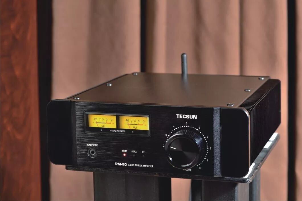 比PM-100更小巧的PM-80,却多了蓝牙音乐接收功能与耳放输出,面板上还配置两只VU表。PM-80的输出功率只有25W(8Ω),内置独立的耳放支持各种高低阻耳机,RCA输入分为高、低电平输入,AUX1用于连接高输出电平的音源,AUX2用于连接低输出电平的音源。对于小小的PM-80,德生一样讲究,比如内置耳放,并且耳放和功放各自采用独立的前级,以及高低电平输入端口的设置。